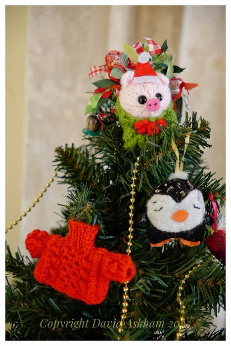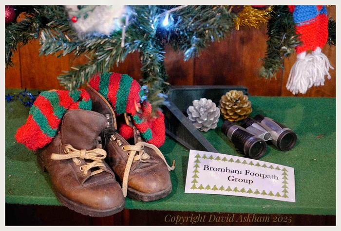 An encouraging sign of self-sufficiency was the active pursuit of locally-produced tree decorations. For example, hand-knitted figures, garments, and even vegetables become durable, if not edible, (and no air-miles involved!). Look how the Footpath Group featured their activities. Who would expect old boots, at a tree base, for a Christmas present?
